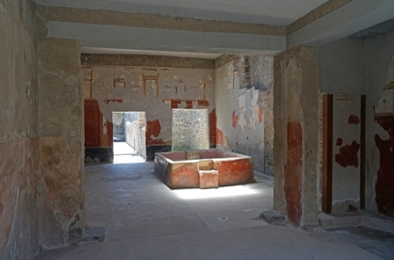 Accanto al quadretto che rappresenta Ippolito e Fedra, inoltre, si apre una finestra che affaccia su un piccolo cortile, con una zona coperta, davanti alla quale è ubicata una grande vasca dalle pareti dipinte di rosso. Attorno ad essa correva un canaletto, progettato per convogliare l’acqua piovana verso un pozzo collegato ad una cisterna sotterranea.