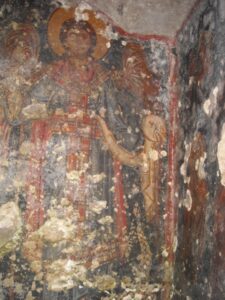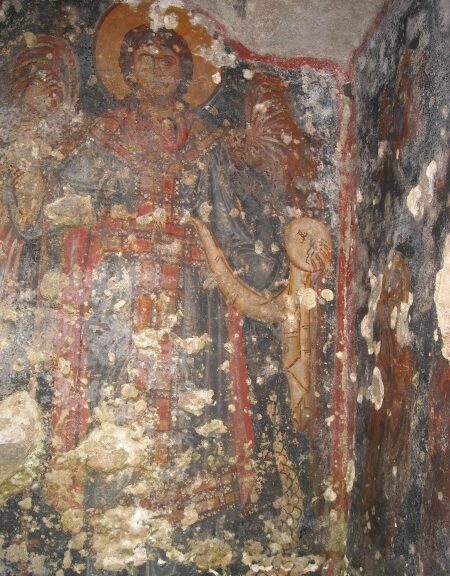 Non è l’unica rappresentazione dell’Arcangelo nel nostro territorio. Infatti nella chiesa rupestre di San Simeone in contrada Famosa si conserva un altro magnifico affresco dell’Arcangelo Michele a figura intera, in abiti militari di Archistratigos delle milizie celesti. Nel Medioevo l’Arcangelo assunse un complesso di attributi, alcune pagane, altre cristiane, riflesse nell’iconografia. La principale è di guardiano armato del sacro bema nelle chiese contro i demòni nonché di difensore dei deboli.