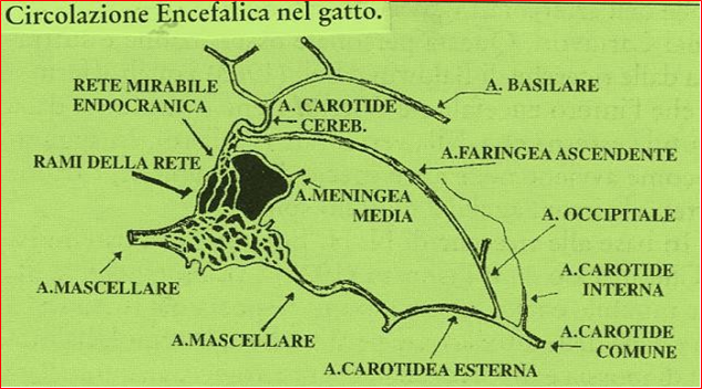 Nel Gatto, la rete mirabile extracranica, forma una specie di barriera cribrosa disposta trasversalmente sulla direzione dell’arteria mascellare esterna. Ne deriva rallentamento e calo pressorio del flusso sanguigno, sia nell’arteria carotide cerebrale, sia nell’arteria mascellare nel suo tratto orale post-rete. …