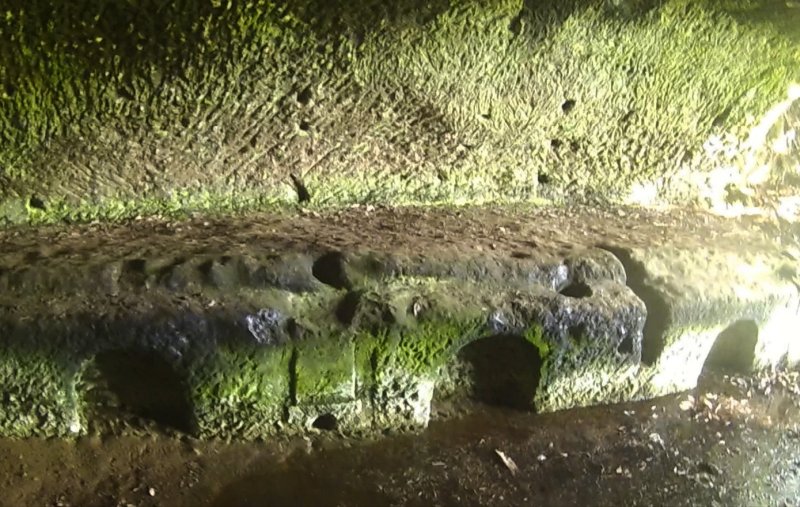 Appena sotto il timpano scolpito si trova una grossa fossa dove si presume sia stata l’ara sacrificale, sotto i podia si possono ancora scorgere le sette nicchie riferite ai sette livelli di purificazione della sfera planetaria e sei cippi, tre per lato, scavati nel tufo dove venivano riposte le statue degli dei.