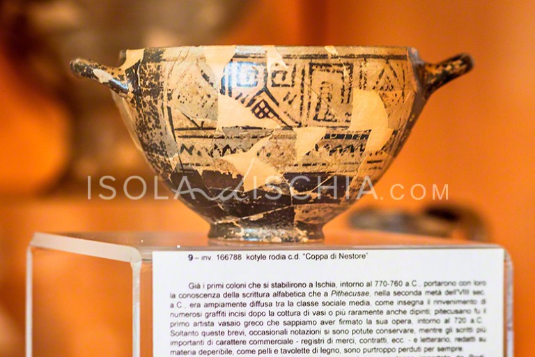 Proprio qui è stato rinvenuto la cosiddetta “Coppa di Nestore” che ci riporta alle radici della nostra civiltà. Si tratta di una Kotyle tardogeometrica, ossia una particolare forma potoria di coppa che i greci utilizzavano per bere durante il simposio. Essa è di manifattura rodia ed è stata importata a Pithekoussai dove ha ricevuto la famosa iscrizione graffita che reca i segni caratteristici dell’alfabeto euboico.
