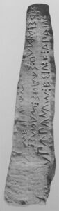 Gli studiosi sono un po’ meno d’accordo in merito allo scritto, inciso sopra il cippo, di origine sud-picena, in alfabeto italico, che è stato riconosciuto come il più antico rinvenuto durante ricerche archeologiche fino a oggi.