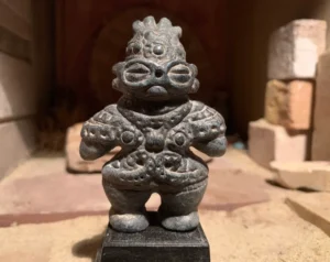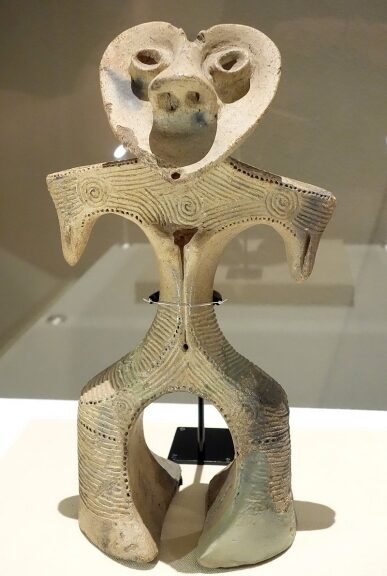 L’osservazione attenta di questi oggetti di argilla dà il destro di esprimere il proprio parere a coloro che ritengono che nel passato ci sia stata la presenza di esseri di altri mondi sul Pianeta Terra (fra questi Erich von Däniken), e in questo caso non è difficile quasi arrendersi ai loro ragionamenti in proposito. Esaminandoli attentamente, questi improbabili – o possibili – rappresentanti di visitatori extraterrestri portano sul capo una specie di casco, mentre occhialoni tondi, come quelli indossati dagli sciatori, proteggono gli occhi. Il loro corpo, è molto robusto, ma con un linea svelta e sicuramente umanoide, con vita sottile. Gli arti, di cui quelli inferiori molto corti e arcuati verso l’esterno, quando non mancano, terminano in estremità che sembra molto difficile chiamarle mani o piedi; forse, il ritenere che al posto delle mani ci siano delle pinze, potrebbe essere per nulla cervellotico. Se si aggiunge, come fa qualcuno di fervida fantasia, il riconoscere nella loro figura l’esistenza di un filtro e l’attrezzatura per respirare, il gioco sembrerebbe fatto: astronauti, nella loro tuta spaziale, pratica e artisticamente adornata, belli e pronti, sono al nostro cospetto.