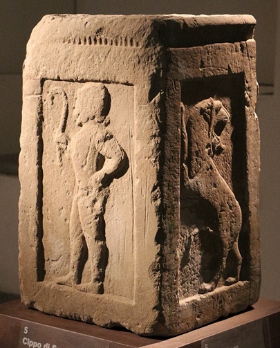 Nel 1983 in Via dei Bruni fu scoperto un cippo funerario simile a quello rinvenuto nella chiesa di San Tommaso. Sulle facce sono raffigurati rispettivamente una figura maschile munita di lancia, un grifo e due leoni rampanti.
