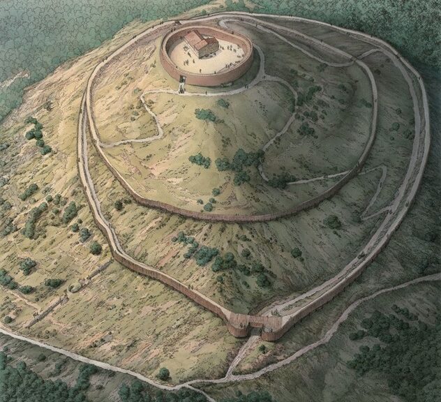 La struttura si componeva di tre anelli difensivi: una muraglia circolare in pietra costruita sulla sommità del colle era circondata da due cinte fortificate ellittiche di fango, pietrisco e legname. Il livello più basso della struttura nella parte settentrionale si raccordava con l’anello intermedio.