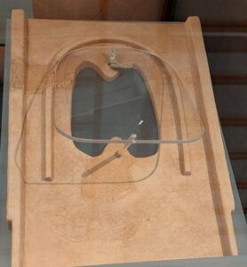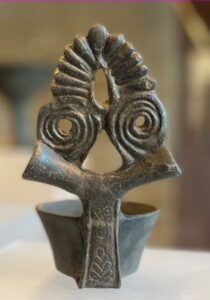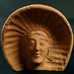 Di seguito le immagini dei resti dell’abitato di Gonfienti, delle fondamenta dell’edificio 1, di antefissa a testa di menade, della tegola lucernario, di kyatos con anse a corna tronche e della coppa attribuita a Douris.
