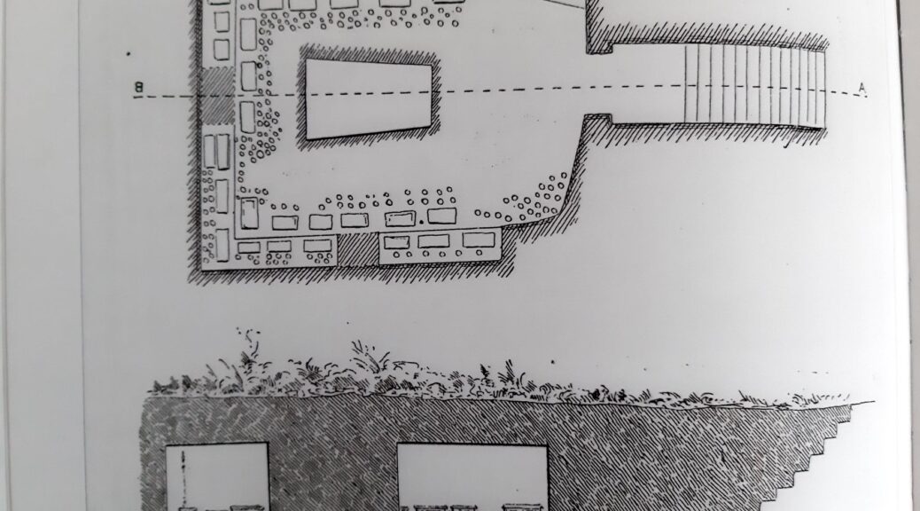Pianta e sezione della tomba dei Calisna Sepu elaborata da Augusto Guido Gatti ed alcuni reperti ritrovati nella tomba.
