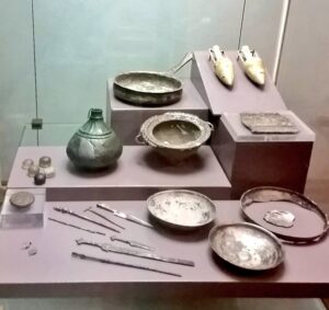 Del suo prestigioso corredo facevano parte pinzette e nettaorecchie d’argento, doppio pettine, contenitori per profumi in alabastro ed in bronzo, pedine da gioco, patere, spilloni e vasellame da mensa miniaturizzato.