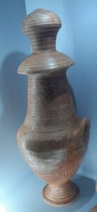 Alcune urne biconiche (databili dalla fine dell’VIII agli inizi del VII secolo a.C.) invece di essere chiuse con scodelle rovesciate avevano originali coperchi a forma di palla, che riproducono schematicamente la testa del defunto. Tale tipo di chiusura, che presenta collo troncoconico sormontato da una sfera cava internamente, veniva realizzata in impasto ma anche in ceramica etrusco geometrica. Due ossuari con coperchio a sfera in ceramica etrusco geometrica provengono dalla tomba 21 di Poggio Mengarelli. Un‘altra urna biconica della specie in impasto fa parte della collezione Cambi, già collezione Paolozzi.