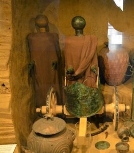 Nella Tomba della Sfinge (metà del VI secolo a.C.), all’interno di una fossa posta nell’atrio, sono venuti alla luce i resti di un busto in lamina di bronzo con aperture per l’inserimento delle braccia ed una testa sferica sempre in lamina bronzea.