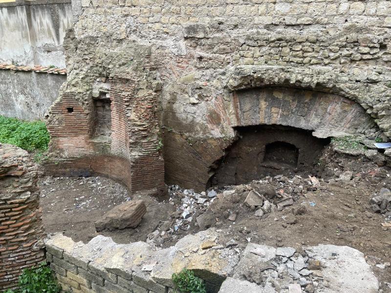 In questa fase si procederà anche all’apertura del nuovo varco di accesso all’area archeologica, posizionato in asse con via Duomo con la collocazione del nuovo cancello, prima tappa questa per rendere visibile dall’esterno il monumento. La progettazione in corso prevede, infatti, la demolizione dell’attuale muro di cinta e la sostituzione con una recinzione in metallo, nonchè un innovativo e suggestivo impianto di illuminazione dei resti. Parallelamente, è prevista anche l’ultimazione dei lavori di pulitura, consolidamento e restauro degli intonaci conservati all’interno dell’ambiente c.d. repubblicano, di cui è stato effettuato l’anno scorso il restauro del pavimento a mosaico con motivo a canestro. Il mosaico e le decorazioni pittoriche, permettono di inquadrare l’ambiente in età tardo – repubblicana (metà del I sec. a.C.); l’ambiente viene poi inglobato all’interno del complesso dell’insula edificata (o riedificata), in un momento avanzato del I sec. d.C., forse a seguito dei danni provocati dai terremoti del 64 d.C. e correlati all’eruzione del 70 d.C.