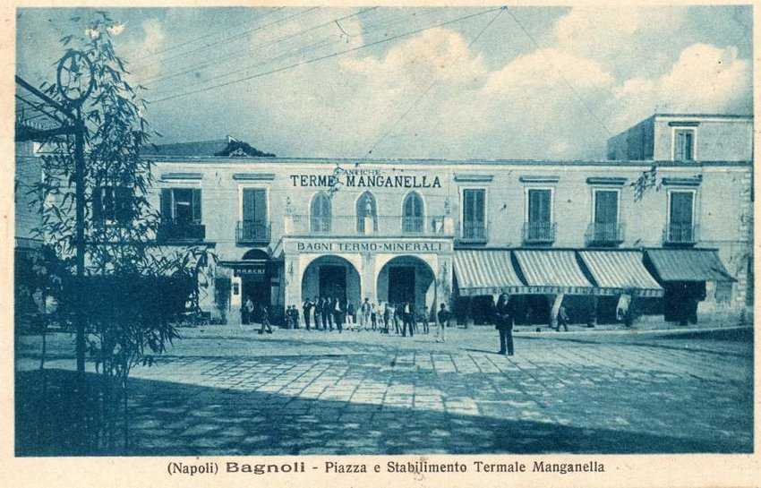Partendo da Posillipo, il primo bagno propriamente flegreo è quello conosciuto come Balneum Foris Cryptae, ovvero Bagno Fuori la Grotta, con riferimento alla Grotta di Seiano (Coroglio), distante 112 passi dalla spiaggia del Lazzaretto (davanti Nisida), e 130 dalle radici del Monte Posillipo, con vicine allora le vestigia di un edificio che si giudicò essere i ruderi di bagni, da una vena d’acqua chiara e un sapore al quanto alcalino. Vi si fece quindi un pozzo in cemento, che fungeva da approvvigionamento idrico per le case vicine, verso il bivio per Coroglio. Conosciuto anche come Bagno dei Giunchi o Balneum Juncariae, perchè sorto in terreno paludoso e pieno di giunchi, successivamente, nei pressi vi nacque lo stabilimento Di Pierno, poi Terme Manganella, alla cui sinistra sorse anche lo stabilimento Hotel Terme Tricarico, mentre a pochi metri dalla piazza, sulla strada verso Fuorigrotta – Via Nuova Bagnoli, venne realizzato lo stabilimento Terme Rocco e così via. L’acqua che alimentava questi bagni fu chiamata da Alcadino: Aqua de Balneo Plage, seu Balneoli. Il primo nome fu dovuto alla sua posizione rispetto alla spiaggia, il secondo, per Eliseo, alla poca lunghezza del bagno.