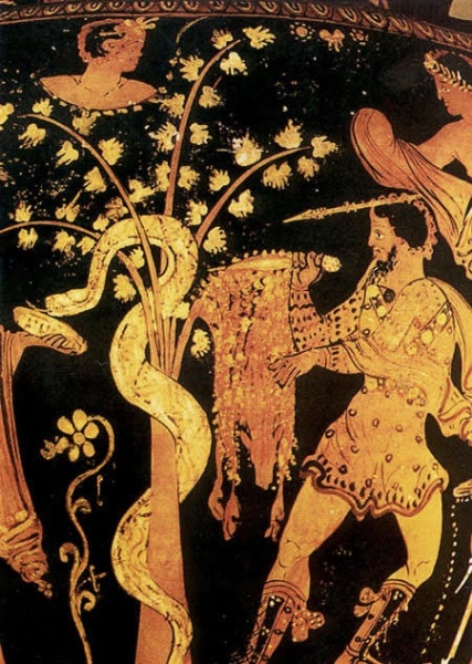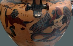 Nelle foto, la Stele di Novilara; Giasone e il Vello d’oro su un vaso apulo a figure rosse del IV secolo a.e.v.; Tifone su un’idria calcidese a figure nere del VI secolo a.e.v.